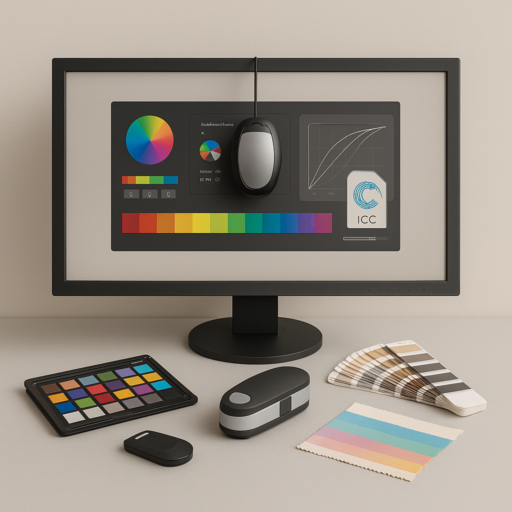 Dosyadan kumaşa tutarlı renk için özel ICC profilleri ve donanım kalibrasyonu.